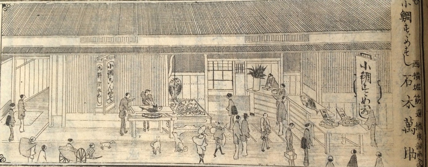 垣貫一右衛門編「浪華の魁」(明治15年7月版行)に見える小鯛雀鮨すし萬本店の外観